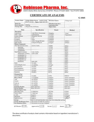 6. COA (Certificate Of Analysis) - Giấy Chứng Nhận Phân Tích Thành Phần Sản Phẩm HB Ginkgo Biloba